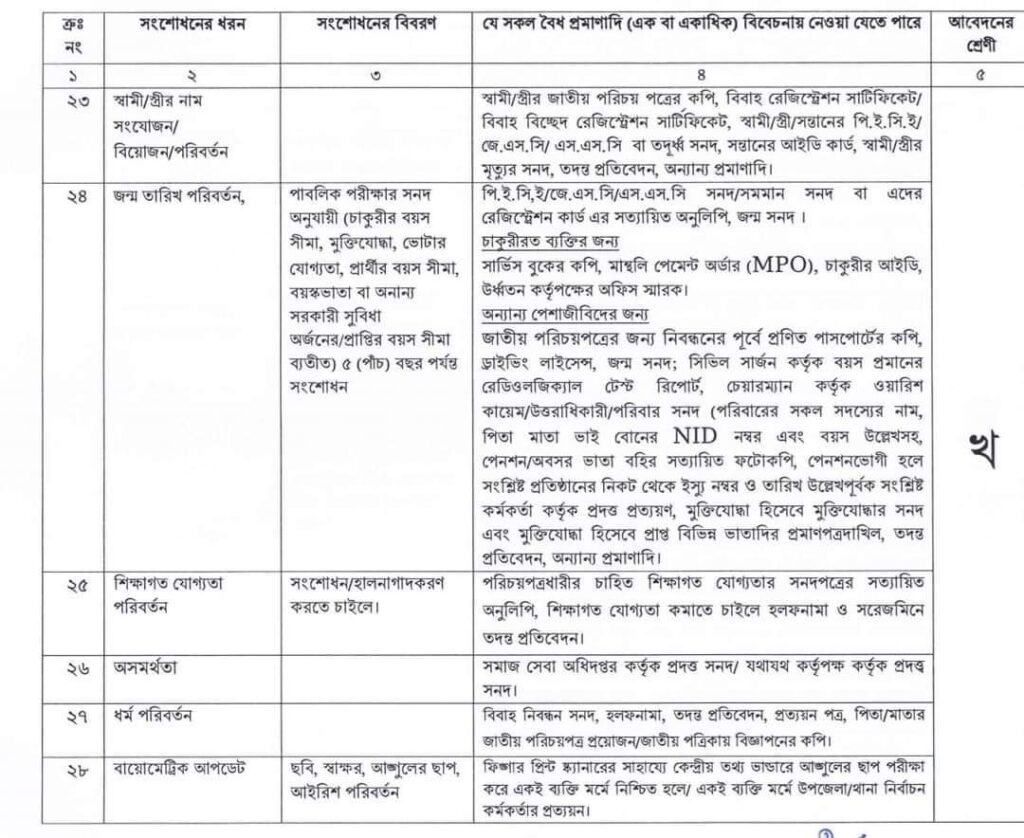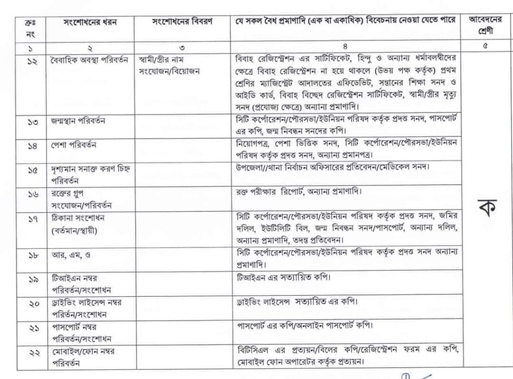 জাতীয় পরিচয়পত্র সংশোধন আবেদনের বিভিন্ন ক্যাটাগরি