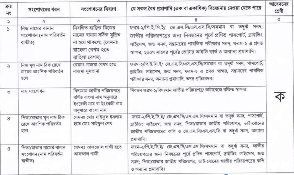 জাতীয় পরিচয়পত্র সংশোধন আবেদনের বিভিন্ন ক্যাটাগরি